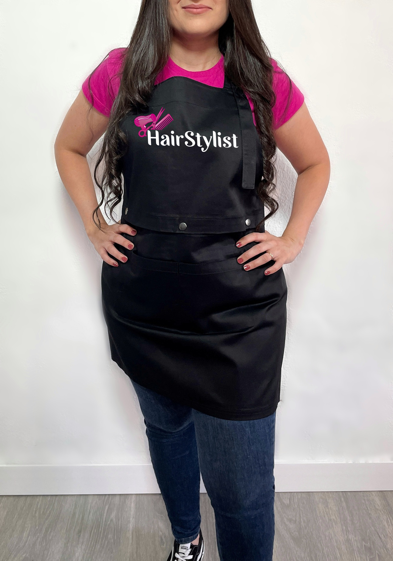 Avental de adulto unisex para profissional de Cabeleireira, Cabeleireiro, Barbeiro, Nail, Lash, Hairstylist. Com alça no pescoço ajustável, Fivela deslizante em plástico reforçado, Duas alças na cintura, 2 bolsos, Gramagem de material de 190G, Composto de 80% poliéster, 20% algodão.