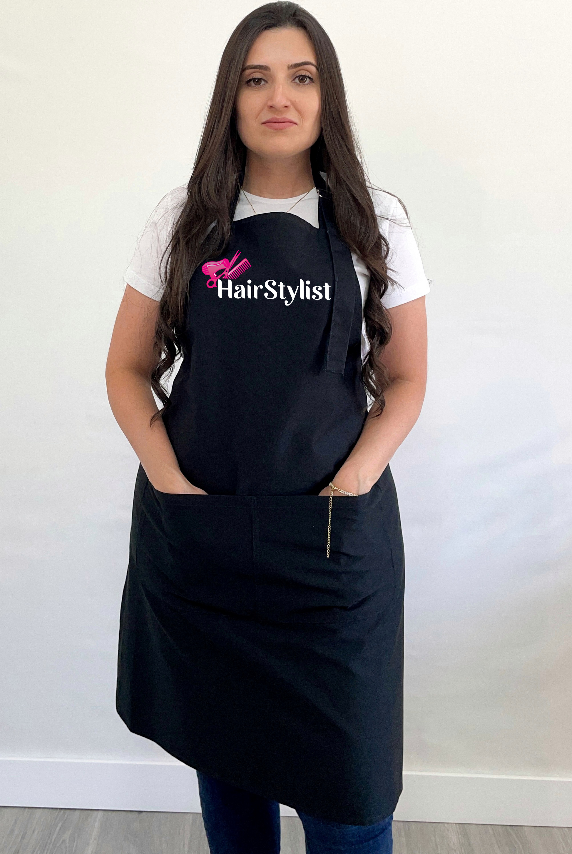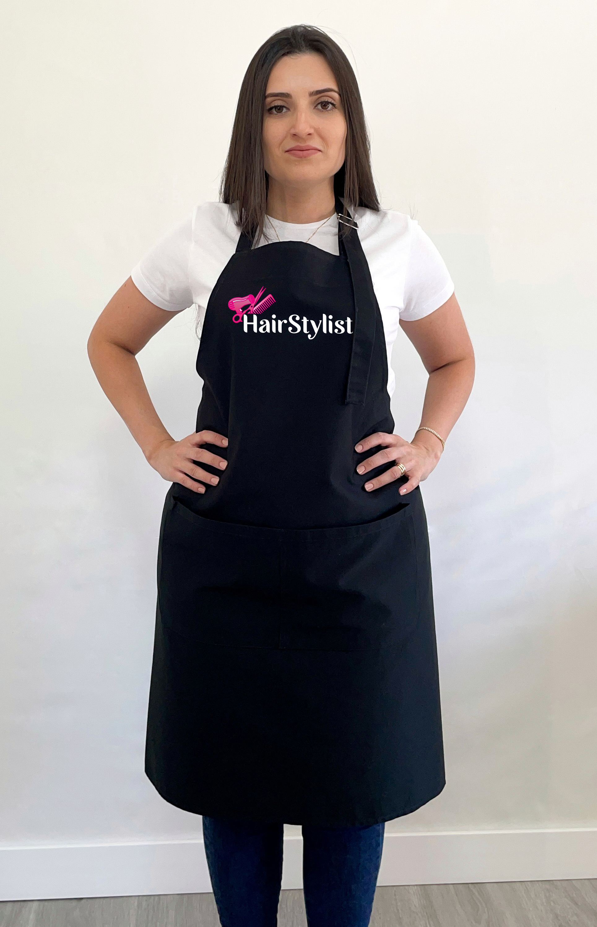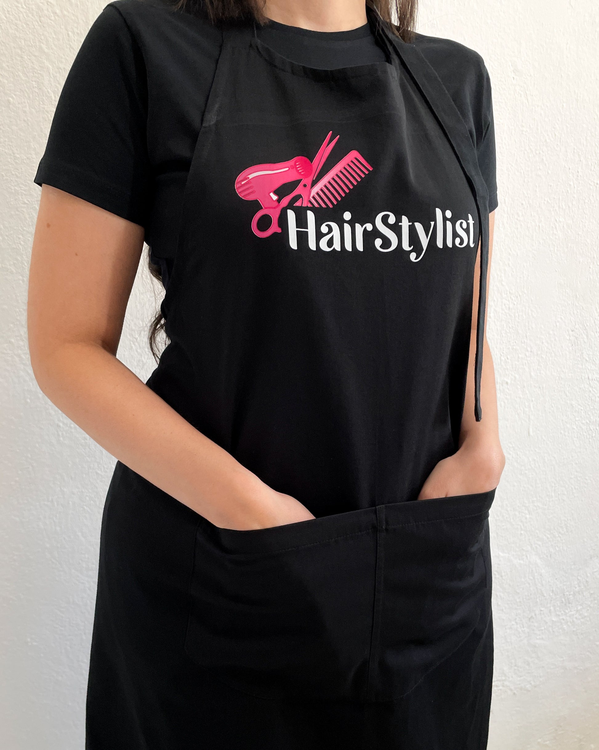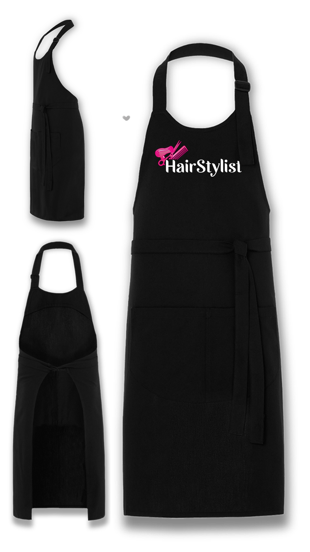 Avental de adulto unisex para profissional de Cabeleireira, Cabeleireiro, Barbeiro, Nail, Lash, Hairstylist. Com alça no pescoço ajustável, Fivela deslizante em plástico reforçado, Duas alças na cintura, Um bolso grande à frente com divisória, Gramagem de material de 180G, Composto de 65% Poliéster e 35% Algodão.