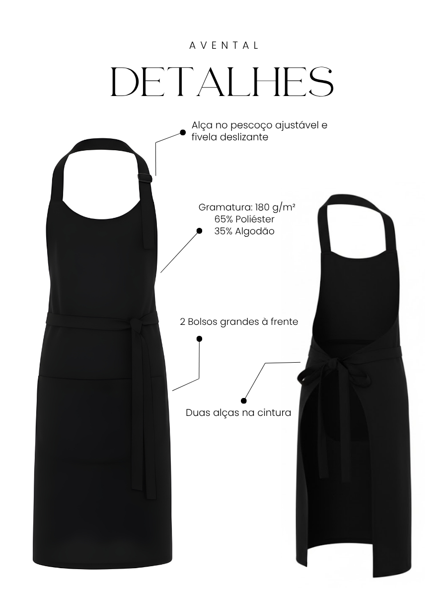 Material de alta qualidade: Com gramagem de 180G, composto por 65% Poliéster e 35% Algodão, o avental é durável, resistente e fácil de lavar.